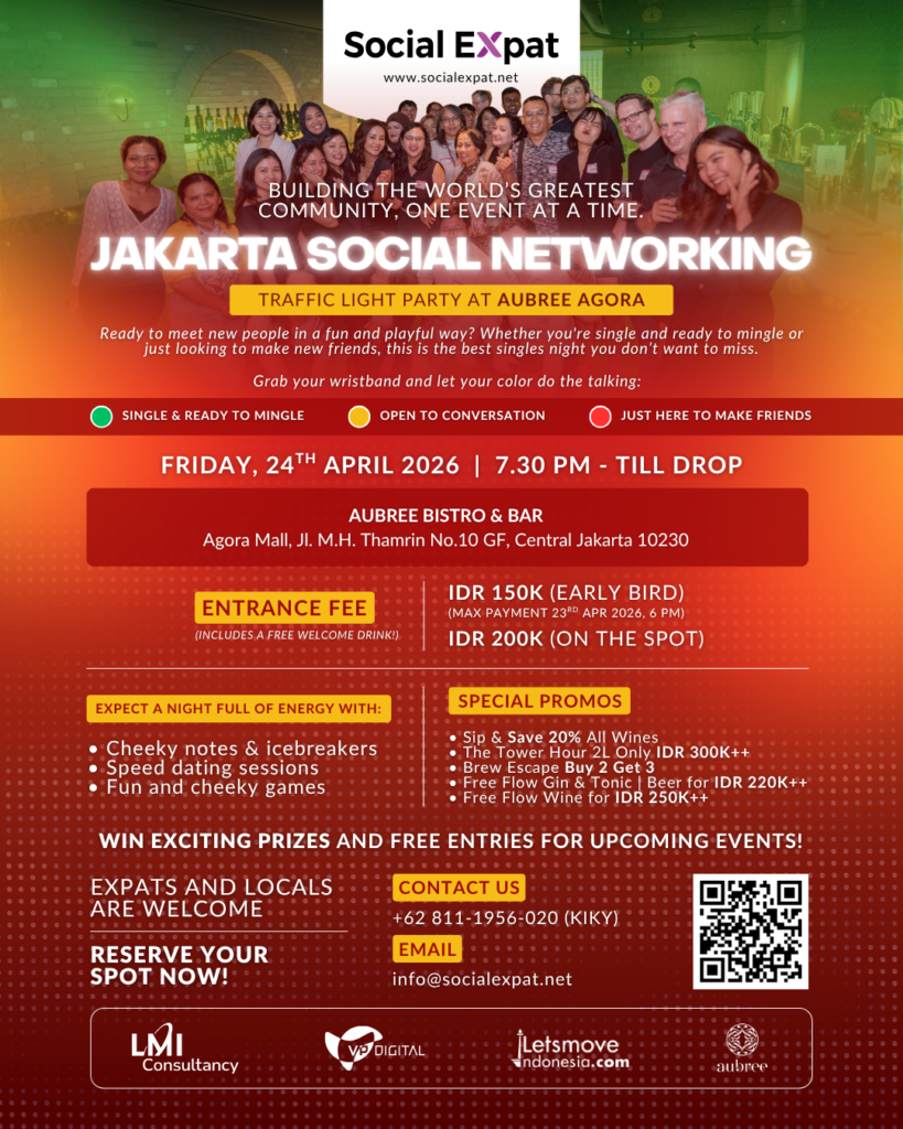 This creative expat networking event adds a playful twist to meeting new people through its “traffic light” concept, where attendees signal their relationship status using colours. Designed to spark conversations and new connections, the event includes social games and interactive activities, making it especially appealing for expats looking to expand both their social and personal networks in Jakarta.