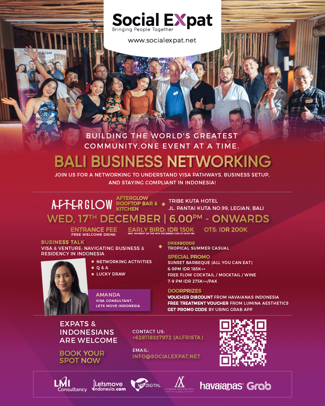 Join us for a networking to understand visa pathways, business setup, and staying compliant in Indonesia! with Special Business Talk: ” Visa and Venture: Navigating Business & Residency in Indonesia” by Amanda (Visa Consultant LetsMoveIndonesia)